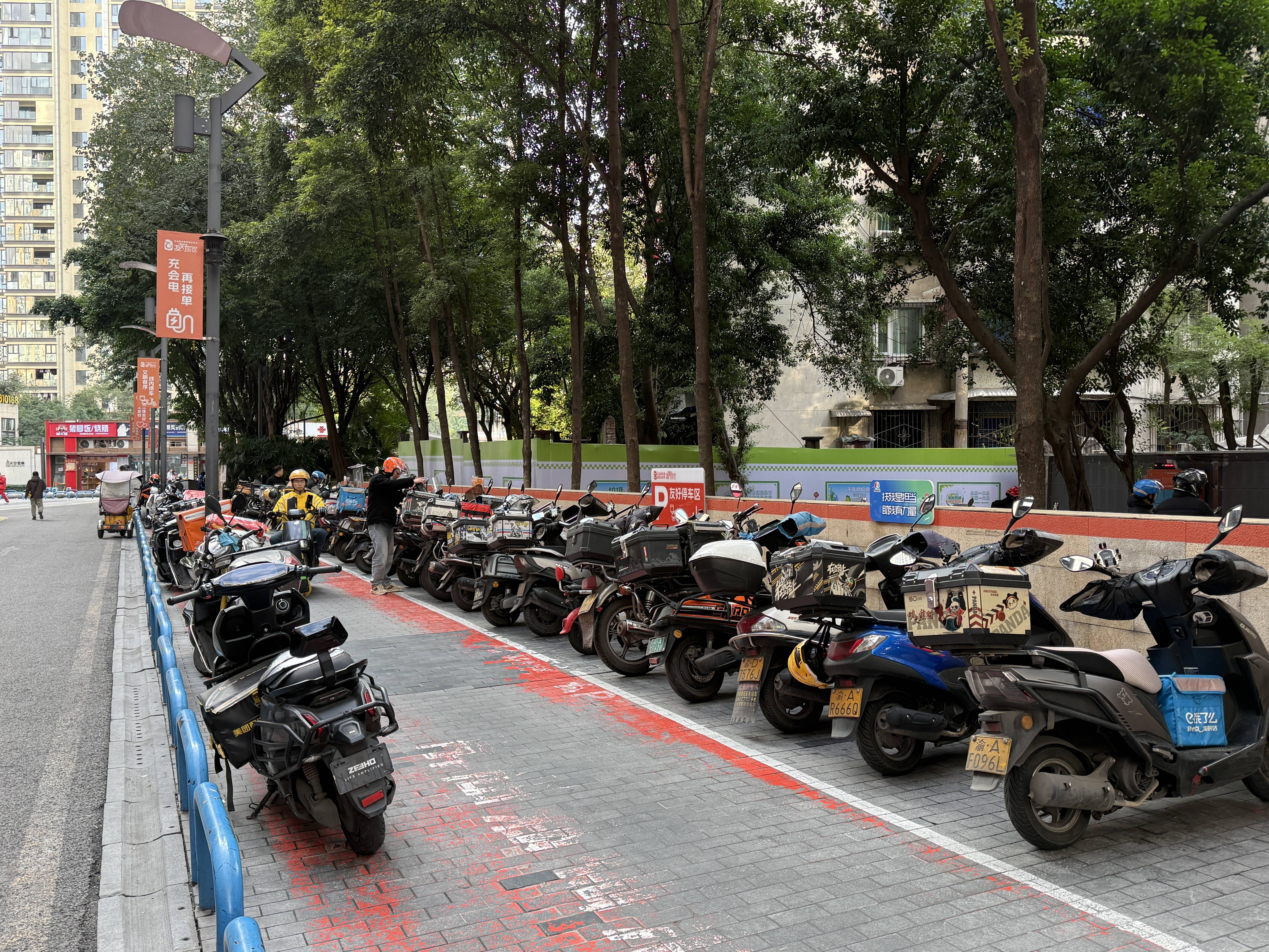 石油路街道设置的骑手停车区。新华社记者 李晓婷 摄走进大溪沟街道华福巷社区院坝,数十辆摩托车整齐停在一侧,“规范停车”示范治理空间显眼处设置了“红黑榜”——规范停车的居民上“红榜”,多次违规乱停车的居民上“黑榜”。