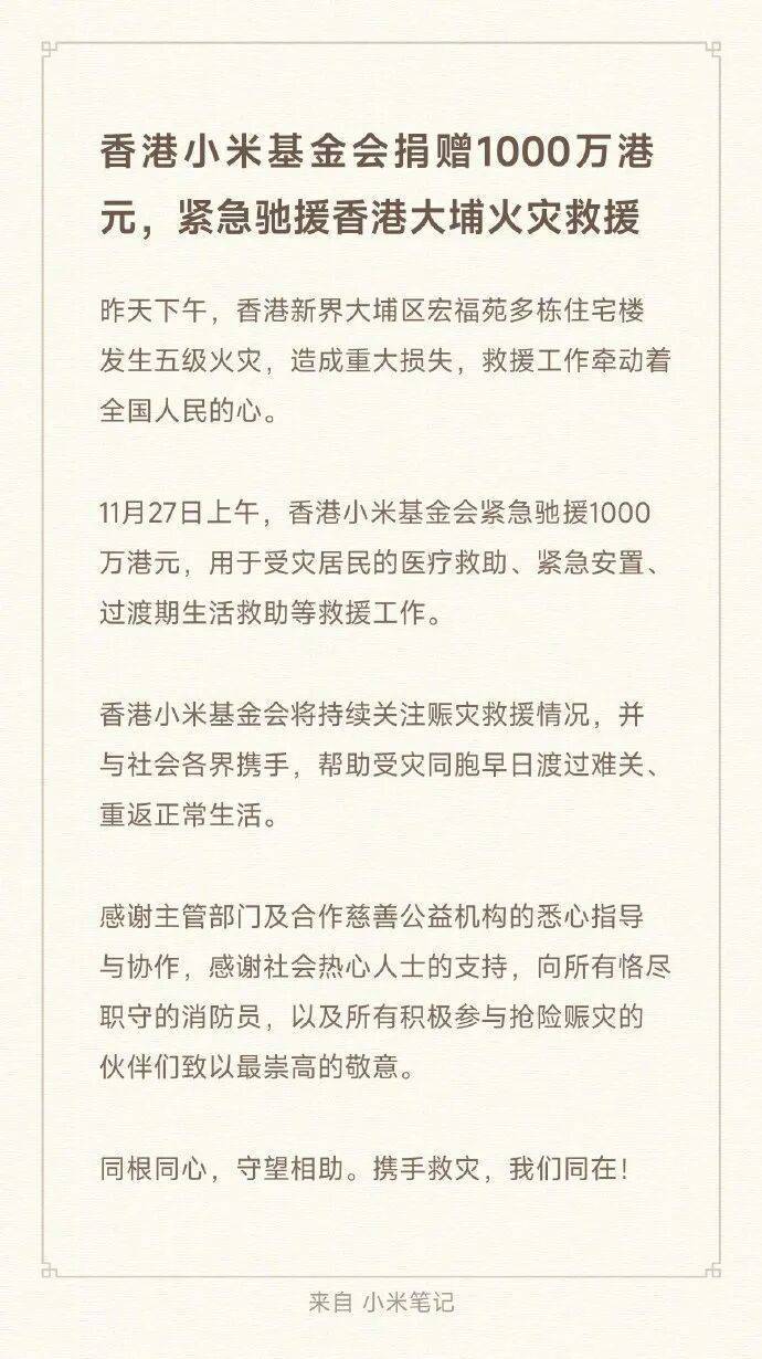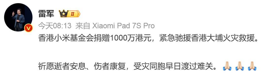 11月27日早,雷军发文:香港小米基金会捐赠1000万港元,紧急驰援香港大埔火灾救援。祈愿逝者安息、伤者康复,受灾同胞早日渡过难关。