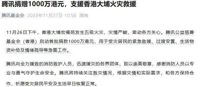 【大河财立方消息】11月27日,腾讯公益慈善基金会(香港)宣布,启动首批捐款1000万港元,用于香港大埔火灾受灾居民的紧急救援、过渡安置、生活物资补给及情绪疏导等急需工作。