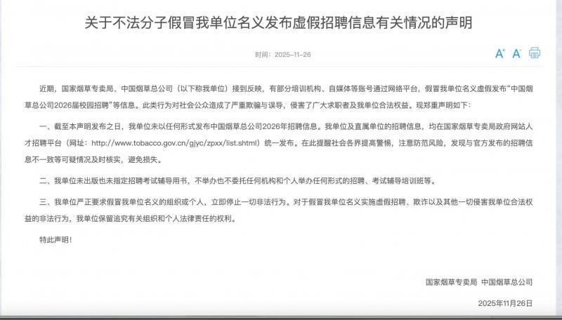 11月26日,国家烟草专卖局网站发布《关于不法分子假冒我单位名义发布虚假招聘信息有关情况的声明》称,有部分培训机构、自媒体等账号通过网络平台,假冒该单位名义虚假发布“中国烟草总公司2026届校园招聘”等信息。此类行为对社会公众造成了严重欺骗与误导,侵害了广大求职者及该局的合法权益。