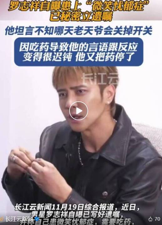 11月19日,据钱江晚报消息,近日,男星罗志祥自曝已写好遗嘱,并称自己患微笑忧郁症,需要吃药,吃药导致他的很多言语跟反应变得很迟钝,影响到他工作,他又把药停了。