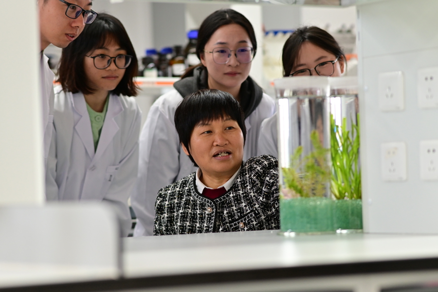 王丽卿与学生们在实验室水草活标本前。 徐瑞哲 摄