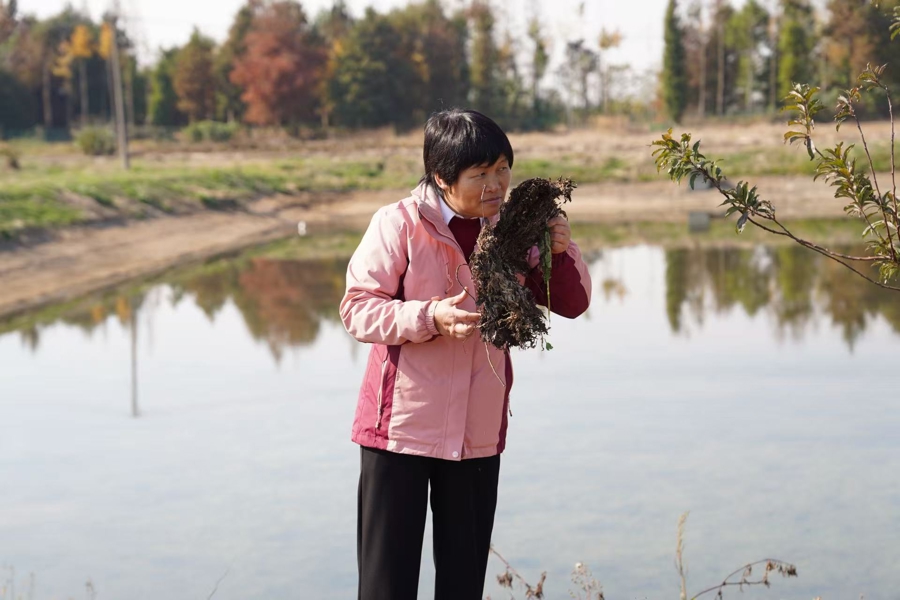 在这个基地,经过20代持续选育的矮生苦草,已成为性状稳定的“主力药材”,实现“一年两茬、快速增殖”。一个穿着水裤的女教授,成为此地常见的角色,她看上去与本地农民真没啥两样。团队还自主研发了水草包草机、全自动水草收集船等专用装备,让池塘变成了“水草工厂”。从选育到规模化扩繁,基地为修复工程提供了源源不断的优质种源保障。