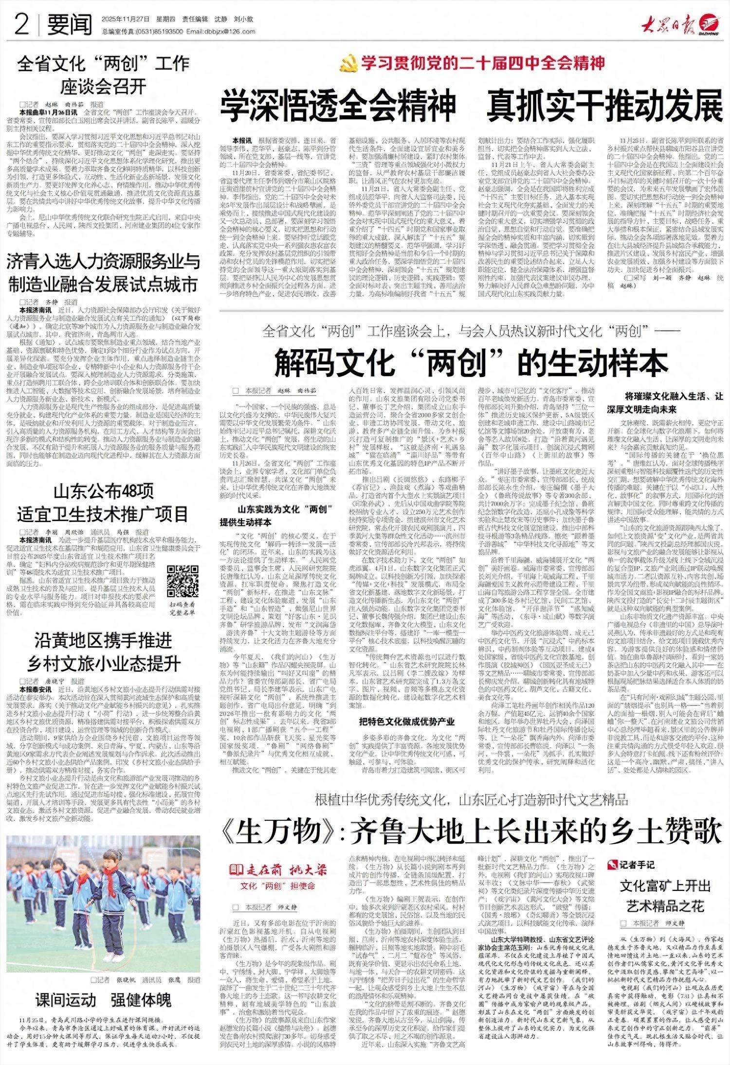 近年来,山东深入实施“齐鲁文艺高峰计划”,深耕文化“两创”,推出了一批新时代文艺精品力作。《生万物》之外,电视剧《我们的河山》实现收视口碑双丰收;《文脉中华——春秋》《武梁祠》等文化类纪录片深度传播中华历史遗产;《戏宇宙》《黄河文化大会》等文综节目创新艺术表达形式,“破壁”传播;《国秀·琅琊》《奇幻聊斋》等全景沉浸式演艺项目,以科技赋能文化传承,演绎中国故事。