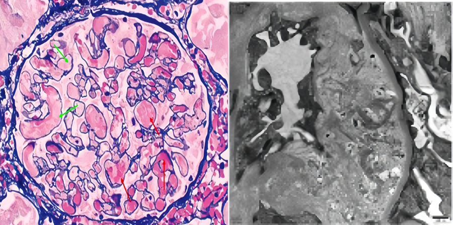 TMA急性期典型的肾小球改变(左);肾脏TMA电镜表现(右)